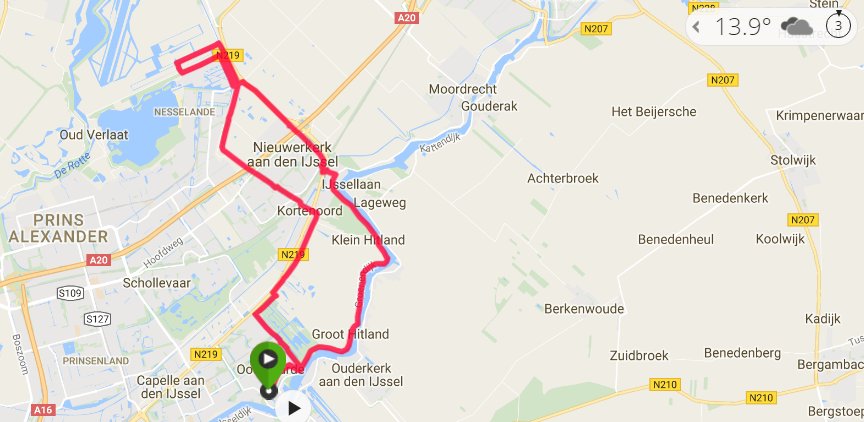 Het is altijd moeilijk om in te schatten hoe ver je kunt fietsen. Zo in Zevenhuizen voelt alles natuurlijk nog goed maar we gaan toch terug en dat is achteraf goed want de afstand blijkt zo genoeg te zijn geweest. Na 23,5 km staan we weer voor de deur. De hartslag van S. was gemiddeld 127. Straks ga ik nog even een stukje hardlopen met woef.