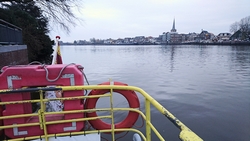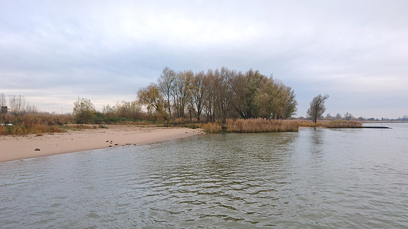 De pont is druk met auto’s maar ik ben de enige fietser. Ik moet eventjes wachten en ik trek snel mijn dunne jackje aan. Goed dat ik dat meenam achter in mijn zakken want dat komt nu goed van pas tijdens het wachten. Ook al is er weinig wind, het voelt best koud door de NO wind. Inmiddels miezert het ook een heel klein beetje maar niets om last van te hebben (vooralsnog tenminste). Ik moet wachten als we aan de overkant zijn omdat ik nog niet betaald heb aan de man die rondloopt en eerst de auto’s doet. Ik betaal mijn 70 centjes en ga weer verder. Aan de overkant is een strandje. Dat ziet er aardig uit!
