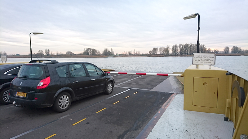 Helaas ben ik net 2 minuten te laat bij het eerste veerpontje. Niet dat de goede man al wegvaart, nee hij blijft gewoon in zijn huis zitten en komt niet tevoorschijn.Ik moet dus een kwartier wachten. Dat valt uiteindelijk nog wel mee, want om 9.26 komt hij alsnog tevoorschijn en we gaan op pad naar de overkant van de IJssel. Daar staan 2 mensen dus ik vermoed dat hij alleen daarom tevoorschijn kwam. Anders had hij me geheid laten wachten tot 9.30. Ondertussen heb ik naar het bedrijf een SMS gestuurd dat ik 11.00 uur niet meer ga halen (zeker niet omdat ik nog met een tweede pontje over moet!).