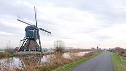 Na de pont sla ik linksaf en even later rechtsaf over de Ammerse kade en rijd een stukje langs het water. Dat wordt steeds mooier eigenlijk en het fietst allemaal prima. Ik kom langs een grote paling rokerij en zie zelfs palingen in het water langs de kant in die grote ronde netten. Nooit geweten dat dat hier te vinden is. Ook staan er talloze molens langs het water. De Achterlandse molen is het mooiste. Ik heb (vanwege de voorspelde regen) geen fototoestel achter in mijn zakken en ik stop dus maar even om met de telefoon uit mijn tasje een foto te maken. Want het is wel mooi om te zien eigenlijk.