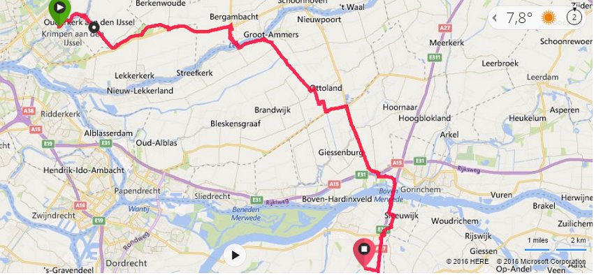 Ik geniet ook wel van de route. Zo kan ik dus fietsen, rondkijken en meteen iets nuttigs doen op deze manier. Het fietsen gaat verder ook prima. Ik heb nergens last van, fiets niet te snel en probeer ook nog een beetje om me heen te kijken. Jammer dat ik nou geen camera mee heb genomen want die had ik makkelijk uit mijn zakken kunnen vissen voor een kiekje onderweg. Ik rijd naar Ottoland en ben verrast over de mooie route. Daar maak ik vervolgens een fout want ik volg netjes mijn geplande route linksaf, terwijl de mooiere weg rechtdoor gaat en daarna linksaf langs het water. Jammer maar helaas. Al snel ben ik bij Schelluinen en nu gaat het opschieten. De rest zal niet meer fraai zijn en ook langs autowegen voeren. Ik ben inmiddels dichtbij de Merwede brug en voordat ik er erg in heb, fiets ik er al overheen. Ik heb geen zin meer om de telefoon tevoorschijn te halen voor een kiekje.