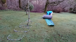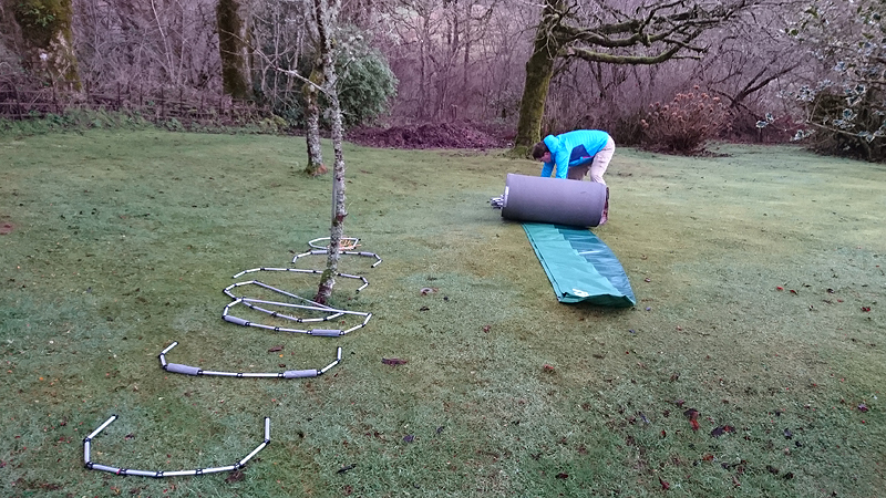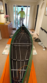 Maar we merken al gauw dat de boot koud is opgeslagen in de garage en dat de skin een beetje strak is. En een boot die schuin op gras ligt, is ook al niet makkelijk op te bouwen. Alles lijkt scheef en we beginnen opnieuw. Dat lukt iets beter maar het gaat nog steeds niet soepel en we krijgen eigenlijk de kano niet in elkaar. We besluiten handdoeken in de hal te leggen en de boot naar binnen te brengen om verder op te bouwen. Als we daar gisteren nou meteen aan gedacht hadden, dan hadden we een schone kano binnen op kunnen bouwen en waren we nu al met het mooie weer op het water geweest…..