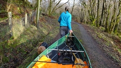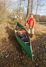 Maar na deze truc zit de kano dan toch snel in elkaar en we brengen de hele handel weer naar buiten en leggen de kano op de kanokar zodat we straks naar de buurman kunnen lopen. Daarna gaat het prima alleen is het weer nu omgeslagen. Als alles eindelijk klaar is, twijfelen we even of we wel zullen gaan. Het is grijs en winderig geworden. We besluiten wel te gaan, al was het maar om te oefenen in het afvaren. We gebruiken normaal een steigertje waarbij je gewoon vanaf een hoogte de boot instapt, maar nu zullen we vanuit het water moeten starten. Dat betekent dus dat iemand in de boot zit, en dat de ander de boot het water in zal moeten duwen en vanuit het water dus de kano in zal moeten stappen. Zo gezegd zo gedaan en al snel wandelen we met de kano op de kar richting de buurman. Dat gaat eigenlijk heel goed en we komen met kar en al zelfs gewoon tot de waterkant.