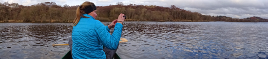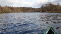 Al snel zien we een soort baaitje en daar varen we heen. Hier liggen we mooi uit de wind en ik droog mijn voeten en benen en trek mijn kanoschoenen aan. Eindelijk kunnen we een beetje rondkijken. Het weer is inmiddels eigenlijk wel redelijk goed op de wind na. Nog niet echt een dag waarop je nou lang buiten op het water wilt zijn maar voor nu is het even goed. We varen het baaitje rond en gaan het grote water weer op. Ik vind dat het best goed gaat ook al laten we ergens de punt verkeerd draaien en vergeten we daarna even door te zetten zodat we inderdaad als een mooie speelbal richting de kant geduwd worden. Zo moet het dus niet. Ophouden met peddelen is er niet bij op dit water met deze wind.