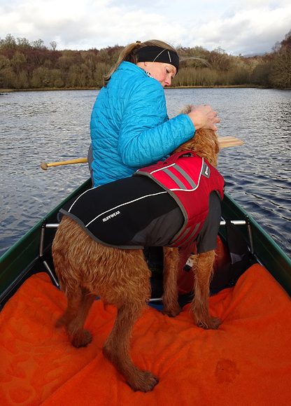 Daarna kijken we eens goed hoe we dit moeten gaan doen want de wind staat fors tegen als we weg willen gaan. Dat wegkomen vanaf de rotsen zal dus niet eens meevallen. Eerst kijken we nog of het gaat met schoenen, of vanaf de rotsen maar al snel besluiten we dat S. in zal stappen met zijn laarzen. Wafje zit al in de kano. Ik heb mijn schoenen en sokken uitgetrokken en die liggen al in de kano. Nu niet verder zeiken maar instappen en dan duw ik de boot verder het water in zodat de kano vrij ligt. Koud is het eigenlijk niet als je maar gewoon doorgaat met bewegen en actief blijft. Ik stap in en dan hebben we even moeite om de kano daadwerkelijk weg te krijgen van de rotsen omdat de wind ons bijna weer de kant op blaast. Maar het lukt en dan hebben we de neus van de kano tegen de wind in en kunnen we weg. Ik heb alleen geen tijd om mijn sokken en kanoschoenen aan te trekken maar koud is het eigenlijk niet eens. Misschien lukt het straks maar nu is het even alle hens aan dek om de kano vooruit te krijgen en in de juiste richting te houden met de punt. Ik vind de golfjes wel lekker deinen maar wat ik dan nog niet weet, is dat S. dat heel wat minder leuk vindt…..