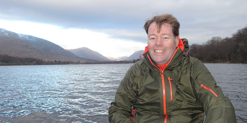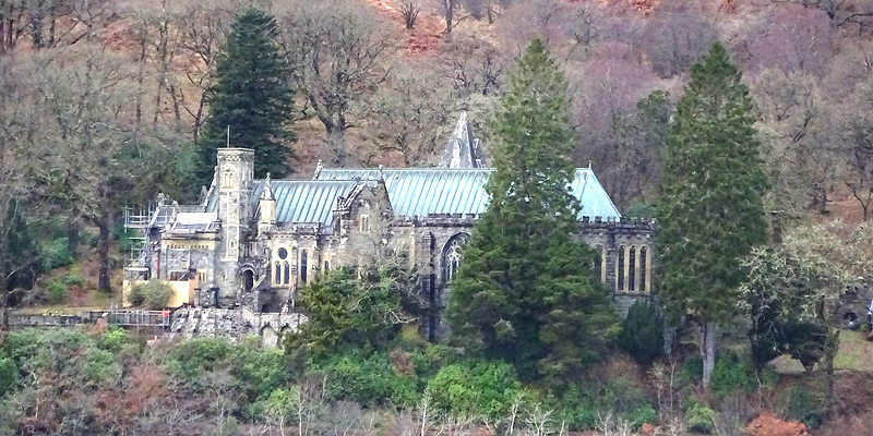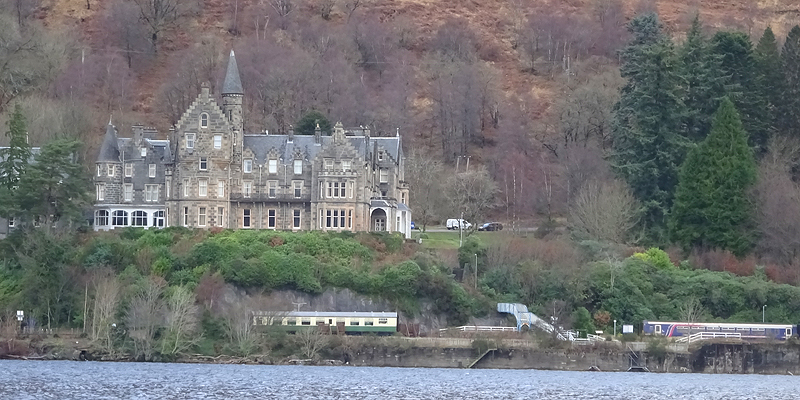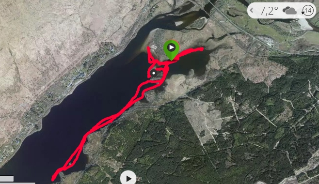 Als we het baaitje uit zijn, varen we het meer op. We zien het Loch Awe Hotel in het dorp bij de railway. Dat is enorm groot en prima zichtbaar. S. heeft echter niet zo’n zin om daarheen te varen. Te eng? Het water is ook best open maar niet wild. We besluiten niet daarheen te varen maar terug te varen naar de eilandjes aan de overkant van het castle en vanaf daar een beetje langs de kust te varen en te kijken. Dat is mooi en we zien weer een dipper. Ook zien we twee vissers die in het water staan en iets uitvreten met een grote vis die in het water ligt. We hebben geen idee wat ze aan het doen zijn maar het is vreemd. We varen verder en zien dat we inmiddels toch echt op de hoogte van het hotel zijn aangekomen. Wat ver weg leek, was dus dichtbij alleen kan je dat dus lastig inschatten op het water. We maken een kiekje.
