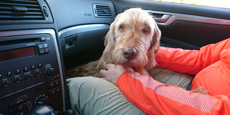 We pakken wat kleding in en gebruiken voor het eerst de witte grote rackpack van ortlieb die we kochten via marktplaats. We worden een beetje gek van de zwarte kanozak waar niks in terug te vinden is en hadden al eerder ontdekt dat de rack packs veel handiger zijn. Daar kan ook van alles in. Als alles in de auto ligt, komen we tot de ontdekking dat woef niet meer achterin kan door de kano op het dak. De achterklep kan natuurlijk niet meer open nu! Woefje moet dus even op de grond voor de voorstoel op dat korte stukje.