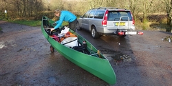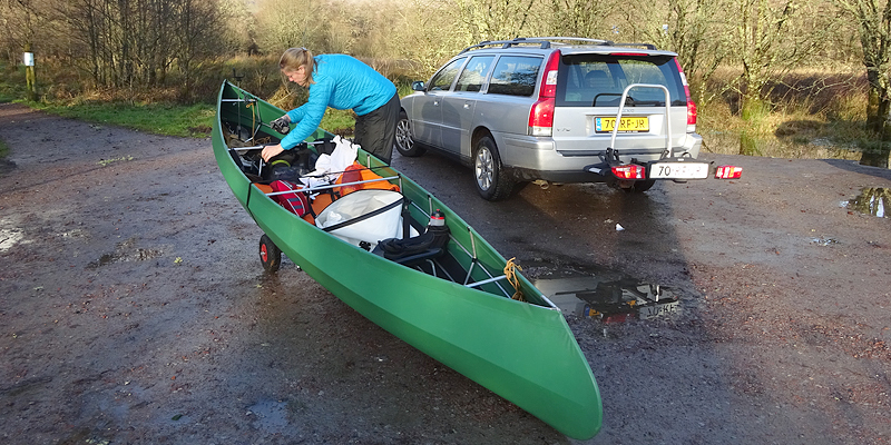 Als we bij de auto zijn, hebben we eigenlijk heel snel de kano weer op het dak. We trekken alleen de sluiting van de spanband van de kanokar kapot. Daar is dat ding ook niet voor natuurlijk! Als we thuis een plekje hebben voor de kano, is het misschien toch een idee om de Thule portage aan te schaffen voor dit doel. Dat is er helemaal voor gemaakt om de kano veilig te vervoeren. We moeten in ieder geval een tweede sleepoog aanschaffen maar die vond ik al voor een tientje. Eerst thuis kijken of de we kano ergens kwijt kunnen voor het geval we toch kano klaar willen hebben voor vertrek.