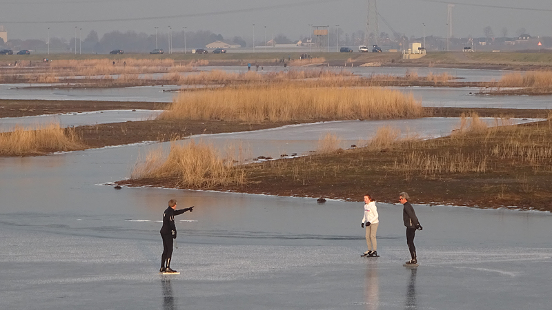 Er wordt geschaatst op de roeibaan en zeker aan de kant waar de weg ook loopt, was het erg druk. Iedereen dus op hetzelfde stukje aan het schaatsen! We rijden een nieuwe stukje route en komen uiteindelijk bij het bekende pad uit waar we normaal ook rijden op de kortere route. Een mooie extra lus en waarschijnlijk zullen we nu dan boven de 30 km uitkomen. Voor het eerst voor S. dan! Als we langs een vaart rijden, zien we dat iemand met een kinderwagen op het ijs wandelt. Die is totaal geschift met dit onbetrouwbare ijs! Echt idioot.