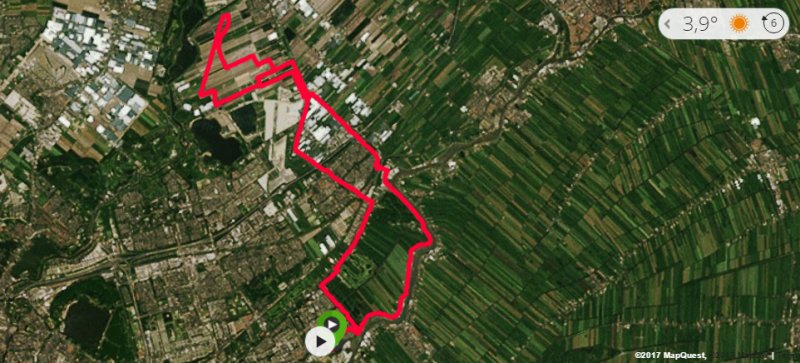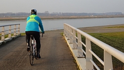Al snel waren we op pad. Voor de zekerheid had ik mijn horloge ook om maar ik was benieuwd hoe de edge het zou doen. Ik had voor het eerst mijn gele Castelli vestje aan over mijn bodywarmer. Zo zou ik tenminste opvallen. We kozen ook voor de dijk als start omdat we anders met de lage zon over de dijk zouden rijden. Daar word je makkelijk van je sokken gereden end aar heben we dus geen zin in. Het fietsen ging eigenlijk prima, ook bij S. Al snel reden we richting Zevenhuizen en daar besloten we om een extra lusje te doen. Omdat er totaal geen wind stond, was het allemaal prima te doen. Als we bij de roeibanen zijn, maken we snel even wat foto’s. Ik kan door het gele vestje niet gemakkelijk bij het fototoestel en het is wel te koud om lang stil te staan. Er zijn dus verder ook geen foto’s van de route. Jammer want naast de roeibaan zit ineens een prachtige brandgans tussen de andere ganzen, en nog vlakbij ook!