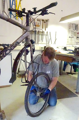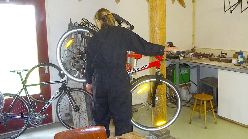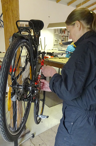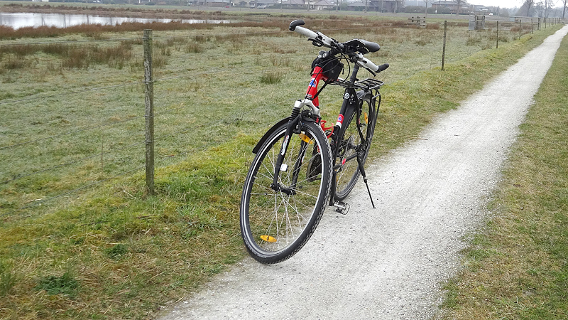 Van fietsen of lopen komt de eerste dag helaas niets. Maar de tweede dag zijn we al wat eerder op en besluit ik op de fiets te gaan. S. gaat met de auto met alle spullen en een fiets op het dak. We gaan vanmiddag immers ook klussen aan eigen fietsen en waarschijnlijk kunnen beide fietsen wel wat TLC gebruiken. Voor dat doel nam ik mijn oude Fuji fietsje mee. Gisteren zei Marten (de docent/framebouwer) al dat de achterdrager het duurste onderdeel aan de fiets was. Ja? En?