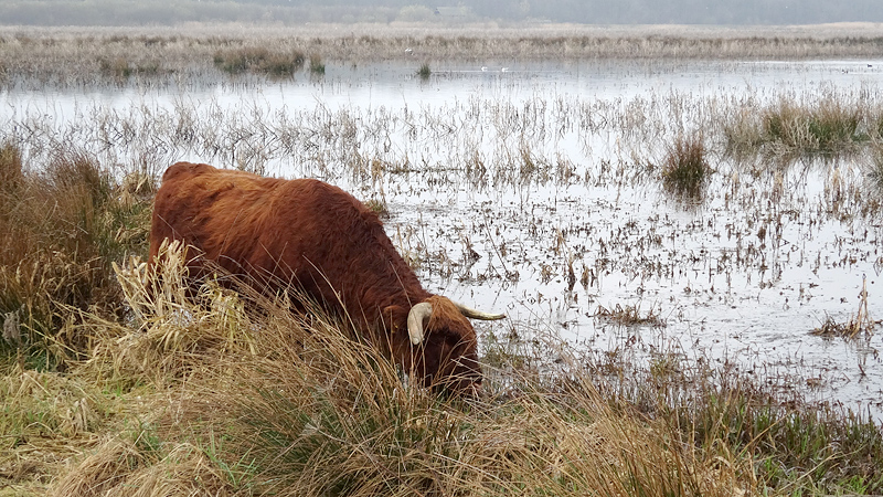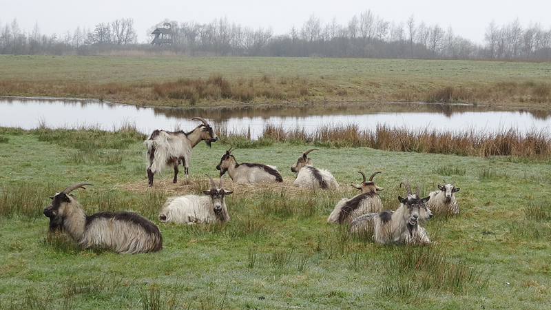 Ik fiets rustig want ik heb geen fietskleding aan en ik wil niet bezweet aankomen daar. Het is overigens nog best fris aan mijn handen en ik ben blij dat ik mijn hardloopshirtje toch maar aangetrokken heb want die mouwen zijn heel lang en kan je over de duimen heentrekken. Daarna voelt alles ook een stuk beter. Ik geniet eigenlijk wel van mijn rondje. Er is volop water, het is heerlijk vlak, er is geen wind en er is van alles te zien. Veel vogels op en rond het water. Hooglanders die langs het water grazen en even verderop mooie geiten met jongen. Ik stop ook enkele keren even voor een foto. Haast heb ik niet.