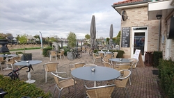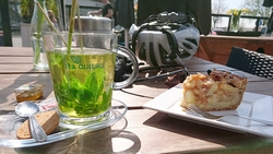 Ik stap af en ga heerlijk even in de zon zitten en bestel wat lekkers.
