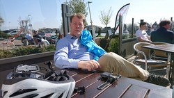 Ik stop natuurlijk even bij hem en hij stelt voor dat we wat gaan drinken en eten bij de start/finish waar ook een restaurantje is. Dat is dus een grote verrassing en hartstikke leuk. Ik fiets gauw het allerlaatste stukje en met 132 km op de teller kom ik bij de finish. Best een stukje! Ik lever mijn kaartje in en ga weer naar buiten waar ik met S. en wafje lekker in de zon ga zitten en verwend word met een heerlijke bol met gerookte zalm. Dat gaat er in als koek natuurlijk.