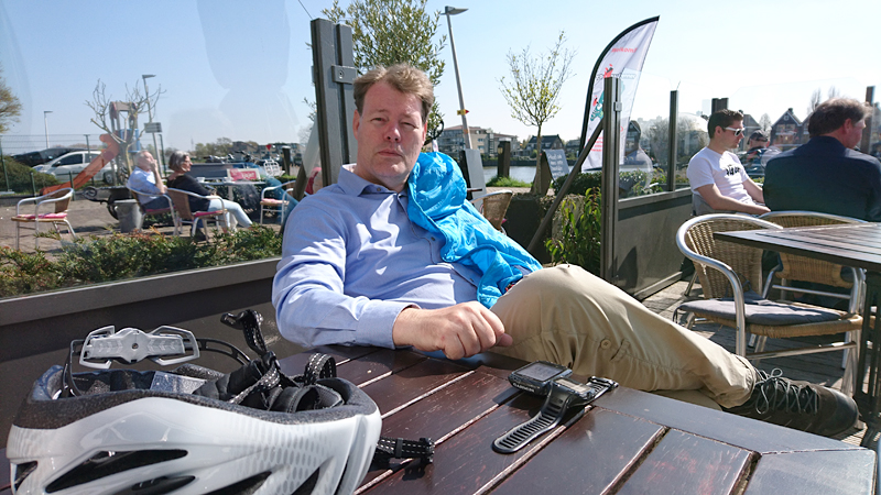 Om ons heen zitten veel racefietsers die ook al binnen zijn. Veel mannen en als we eens goed luisteren horen we allemaal sterke verhalen. Ook over ‘dat chickie dat aan het hardlopen was’. Kan je nagaan waar die mannen al niet op letten onderweg. Altijd leuk om mensen en fietsen te kijken maar het is gelukkig niet erg druk.