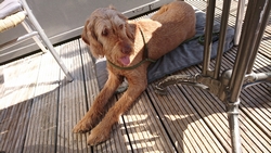 Ik zie niets en ik rijd de bocht bij Paradijsselpark. Ik ben er nu echt bijna. En dan zie ik ineens een leuke hond en een leuke man bij het monumentje zitten waar ik linksaf moet slaan naar de finish. Wat leuk!!! S. is buiten met wafje en zit op mij te wachten. Hij maakt een foto als ik nog op de dijk fiets.