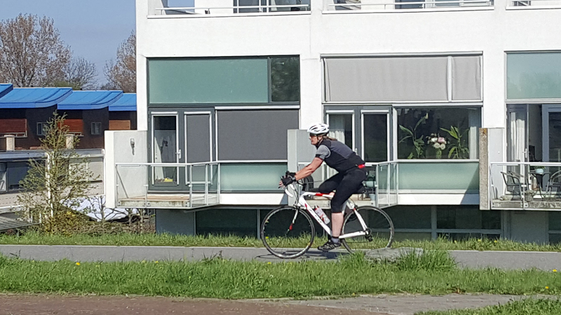Ik fiets al eeuwen alleen maar het gaat goed. Gelukkig is er nog steeds heel weinig wind en ik ben tevreden over mijn kleding keuze. 3/4 fietsbroek en een shirt met korte mouwen en daaroverheen mijn dure Castelli giletje. Niet te warm en niet te koud ook al had ik het even heel koud toen ik in Noordwijk weer opstapte. Maar toen was het ook nog erg bewolkt en vrij fris. Inmiddels schijnt de zon af en toe een beetje maar net genoeg wat mij betreft. Overigens rijden de meeste fietsers die ik in het begin zag in dikke kleding met lange mouwen en lange broek. Ik ben ook een koukleum maar te warm op de fiets is echt niet fijn! Het Castelli giletje is zijn geld dubbel en dwars waard want dat houdt het hele lichaam aangenaam warm.