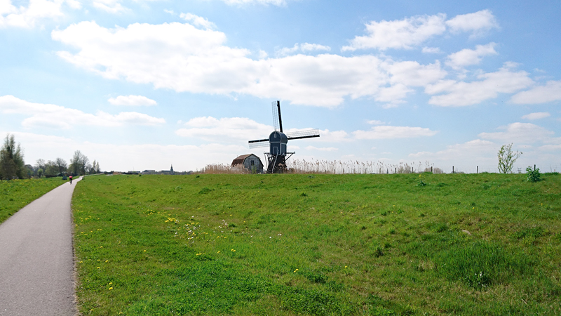 Na Noordwijk volgt de route de weg naar Noordwijkerhout en Sassenheim en vanaf daar met een omweg naar Kaag en de plassen daar. Ik weet eigenlijk niet waarom ik geen foto maakte want het water met de bootjes was ook erg mooi.De teller komt op 72 km te staan als ik langs het water rijd. Nog ruim 50 km fietsen dus! Da’s best een stukje eigenlijk maar ik doe maar net alsof ik dat nog niet doorheb. Alles gaat goed, het tempo blijft er mooi in en mijn enkel en been doen het ook wel goed. Via Nieuwe Wetering en Rijpwetering rijd ik weer verder. Ik ga dus nu weer op de terugweg. De route gaat verder….. Hoogmade, Koudekerke, Hazerswoude Dorp, Boskoop. Boskoop klinkt al lekker dichtbij huis! Als ik bij Waddinxveen rijd, staat de teller ineens op 100 km. Ik maak een foto van een molen daar en rijd weer door. Vreemd genoeg is daar ineens de groep weer die vraagt of alles goed is omdat ik langs de weg sta voor de foto. Zij hebben blijkbaar ergens lekker koffie gedronken. Ik niet, want bij navraag bij twee andere fietsers die ik inhaal, blijk ik ook het bordje voor de koffiepauze gemist te hebben onderweg.