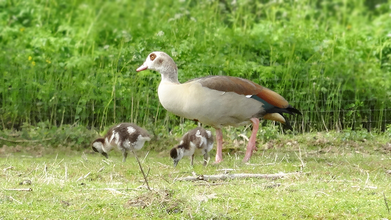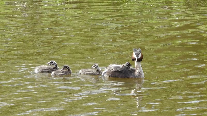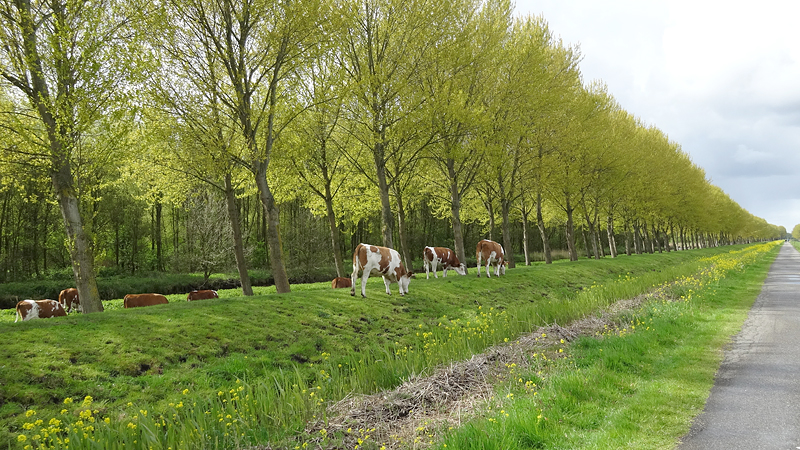 Het gebied rond de Dobbeplas en het Delftse Hout is ook prachtig. Ik geniet volop want ik zie meteen al jonge Nijlgansjes die wij hier nog niet hebben en ook een futen moedertje met maar liefst 4 jongen die al redelijk groot zijn hoewel er nog eentje op de rug van moeder mee vaart. Verderop rijd ik over een fraai fietspad met koeien dichtbij en even later ook schapen met lammetjes.