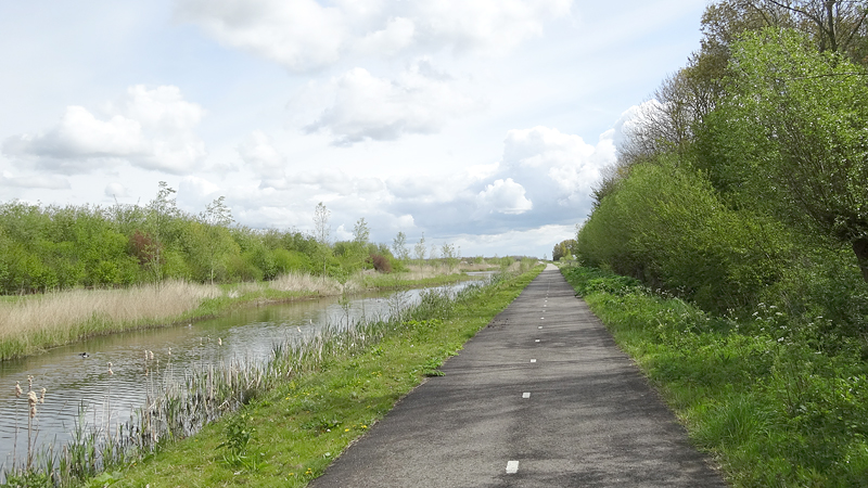 Als ik bij de Dobbeplas kom, rijd ik even verkeerd. Ik rijd gewoon richting de plas zonder op te letten dat de weg naar rechts afbuigt. Kennelijk verwacht de organisatie dat al want achter me staat keurig een pijl naar links. O ja! Daar loopt het fietspad dus gewoon en al snel zit ik weer op de route. Maar ik vind het ook leuk om om me heen te kijken dus dan gaat er wel eens iets verkeerd. Overigens had de Garmin al meteen gepiept dat ik verkeerd zat, alleen zag ik de juiste weg niet zo snel.