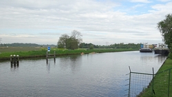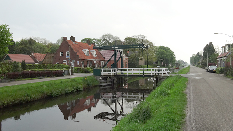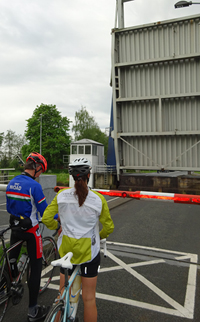 Als ik een piepklein stukje gereden heb, sta ik meteen stil voor de open brug. Dat duurt enorm lang! Voor me staan 2 racefietsers die blijkbaar met een tocht meerijden want ik zag al een bordje hangen van een vereniging met de pijlen. Ook zij staan te wachten en koelen dus lekker af.