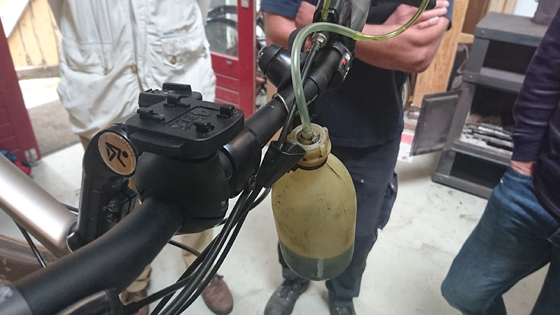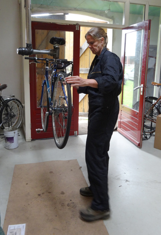 Woef gedraagt zich deze keer keurig. Ze kent het natuurlijk van de vorige keer en ligt te slapen onder de werkbank of ligt lekker buiten in het zonnetje. Het weer is afwisselend zonnig en nat met keiharde regen en onweersbuien. Maar we komen elke keer net goed uit ook om haar uit te laten en fijn buiten te lunchen. We hoorden weer een heleboel en in de middag gaan we het remsysteem van de Koga opnieuw vullen en ontluchten. Dat remt meteen een stuk beter!