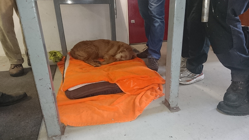 We blijken maar met 6 man te zijn waarvan er 2 bekend zijn van de vorige cursus. Dat is best leuk. S. komt niet veel later ook aan met woefje. Ik heb het onwijs warm en moet even uitwasemen. Gelukkig kan ik snel een ander shirtje aantrekken en mijn overall en daarna starten we met de cursus.