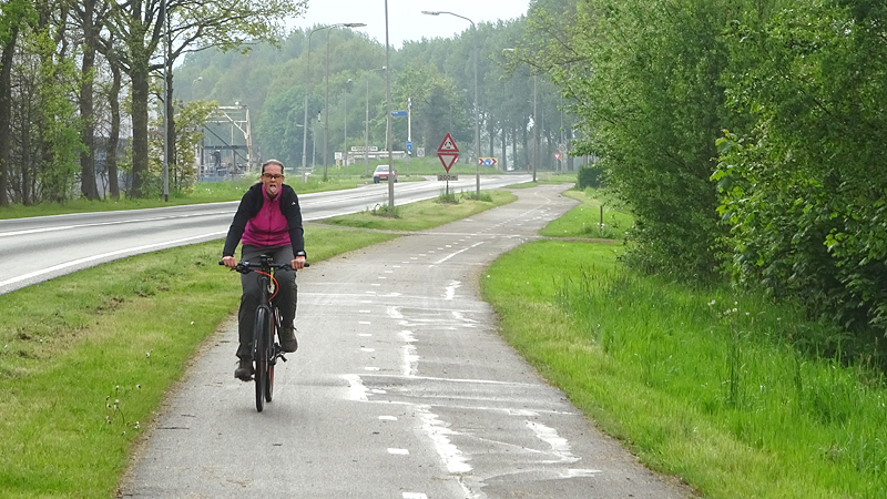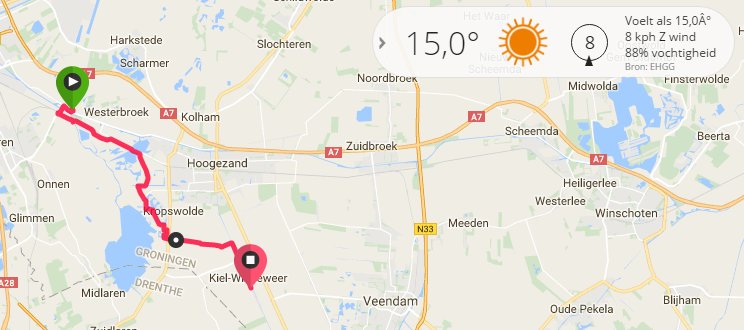 Als we eindelijk na 6 minuten wachten (wat best lang is als je een beetje haast hebt) weer mogen rijden, zitten we elkaar een beetje in de weg. We rijden dezelfde route en de dame van het stel rijdt te langzaam naar mijn zin en dus haal ik in. Maar dat gaat allemaal best snel. Al gauw rijden we als groepje. De dame probeert een stukje voorop te rijden maar dat haalt ze niet mede door de tegenwind en ik haal dus weer in en rij op kop. Na een kilometer komt de man van de stel op kop rijden en rijden we weer achter elkaar. dat gaat best lekker vlot zo dit eerste stukje. Dat schiet lekker op met dit tempo maar ik moet op mijn fiets natuurlijk best aanpoten. Ik zweet me rot. Als ik uiteindelijk even achterop rijd, rijden ze per ongeluk rechtdoor waar zowel zij als ik rechtsaf de weg moeten vervolgen. Dat heb ik natuurlijk in de snelheid niet in de gaten en ze zullen wel balen dat ik niets heb geroepen. Ik heb echter geen bordje gezien en ik rijd natuurlijk mijn eigen route. Toch voel ik wel dat ze het vervelend zullen vinden en niet aardig van mij (als ik bij de tocht zou horen). Gelukkig halen ze me met dit tempo uiteindelijk niet meer in en sla ik ook linksaf aan het einde van het pad langs de smurfenhuisjes en gaat de route rechtsaf. Inmiddels regent het en ik maak dus geen enkele foto onderweg. Ik geniet wel van het rijden zo en keurig op tijd sta ik voor de deur bij de boerderij waar de cursus gehouden wordt. (vervolg onder de gegevens en de map)
