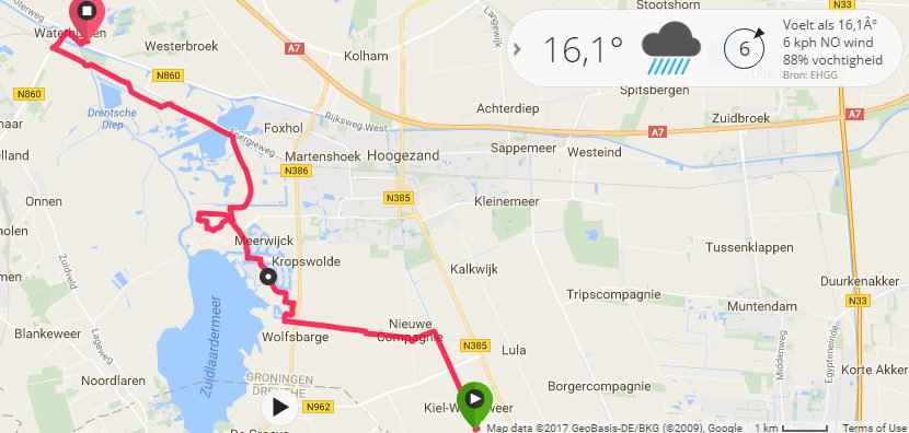 Al rijdend mis ik een afslag. Ik kon de route van de heenweg op de Garmin niet omkeren voor de terugweg en de navigatie richting het hotel doet rare dingen. Als ik het niet meer herken, ga ik dus op de telefoon kijken waar ik ben en waar ik heen moet. Ik kan een lusje maken en weer op de goede weg komen en dan herken ik het ook weer. Ik besluit maar een beetje door te gaan fietsen zodat ik niet al te laat ben en eigenlijk ben ik best moe inmiddels. Ik ben dus blij dat ik er ben. Tot mijn plezier staat S. op het fietspad voor het hotel te wachten. Hij had natuurlijk aan mijn GPS beacons al gezien waar ik uithing!