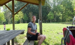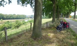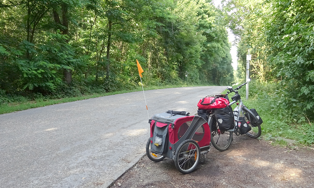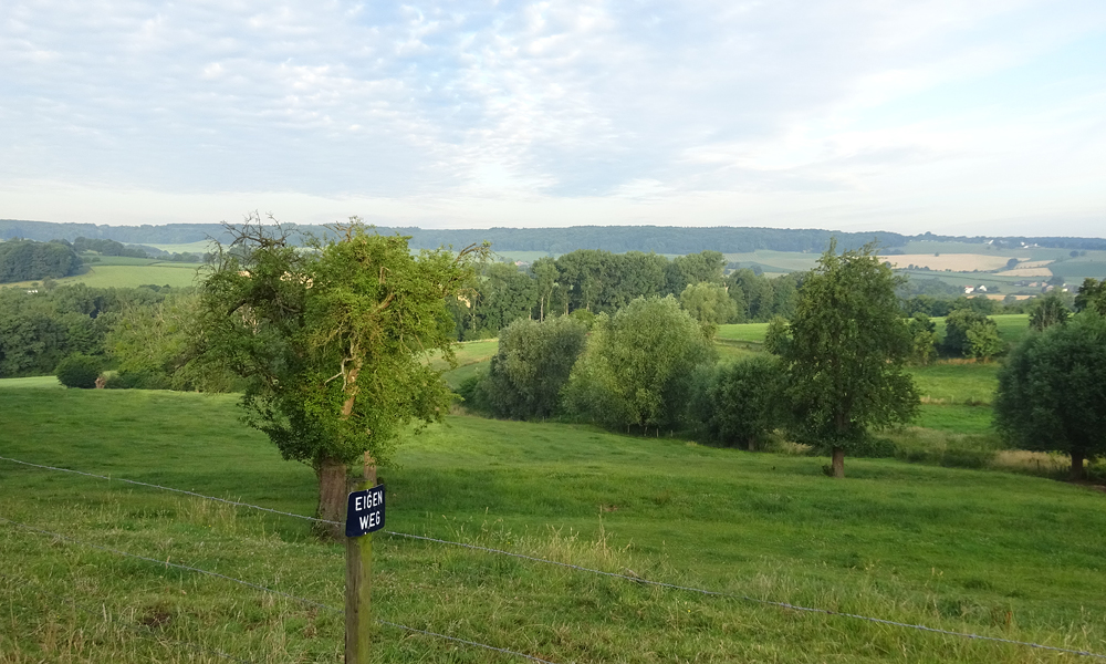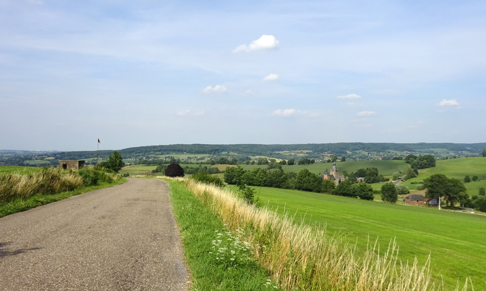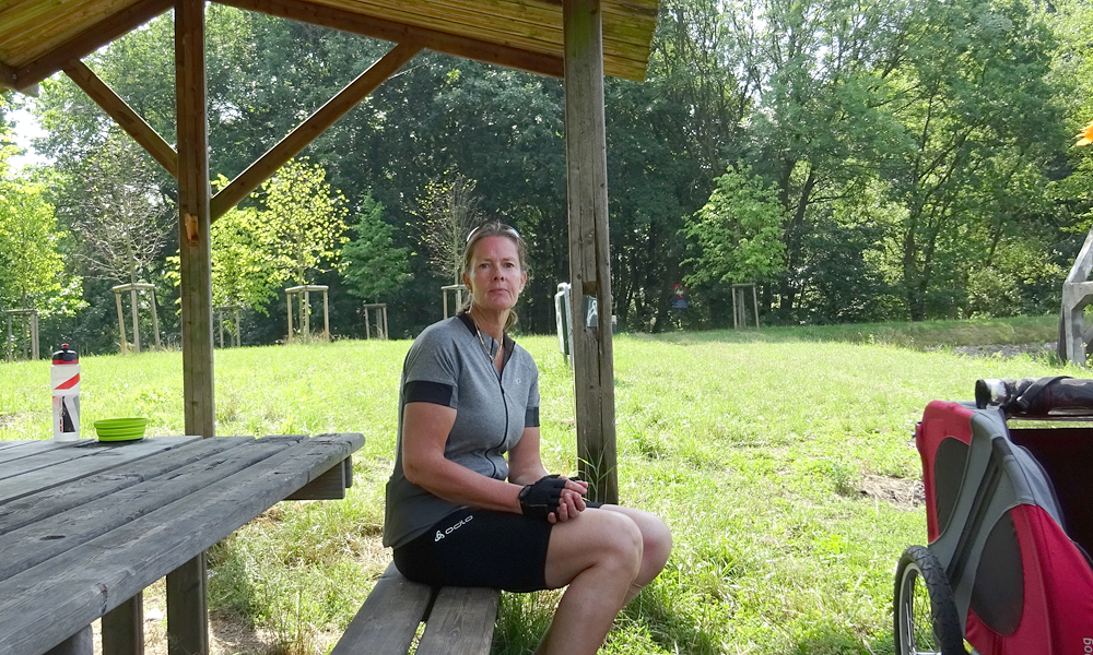 Vanaf dat moment gaat het inderdaad af en toe klimmen. Dat varieert van geleidelijke stijgingen die goed te doen zijn tot klimmetjes die niet te doen zijn. Ik moet ergens dus ook afstappen. In mijn eerste versnelling kwam ik een heel eind maar toen ik zag dat ik er nog niet was besloot ik toch even te stoppen toen ik een bankje zag. Niet veel later kwam er iemand voorbij die haar elektrische fiets aan het duwen was. Verkeerde versnelling en dan kan je dus niet verder. Ik had het gigantisch heet ook vooral tijdens het klimmen en woefje kon daar niet uit de kar. Vandaar even pauze. Het landschap is overigens meteen anders hier. Echt Limburg en ook de paar dorpjes waar ik doorheen fiets zien er anders uit.