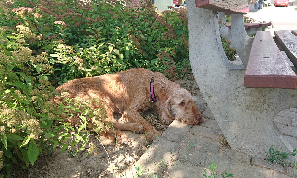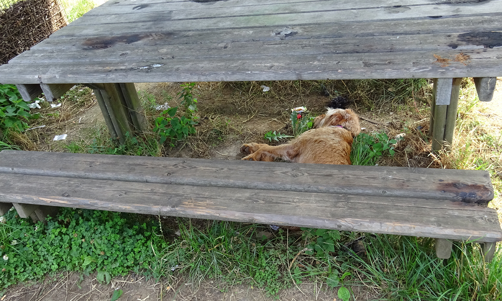 Ik smikkel zelf van de twee lekkere zoete broodjes en woef krijgt ook haar eten. Die broodjes zijn heerlijk en ik vind het jammer dat ik er niet meer mee nam. In ieder geval heb ik deze dag gewoon wat te eten onderweg en dat is ook nooit weg. Ik wandel een stukje moet woef zodat ze alles kan doen en even lekker kan snuffelen. Verder doet ze een dutje onder de bank in de schaduw.
