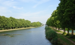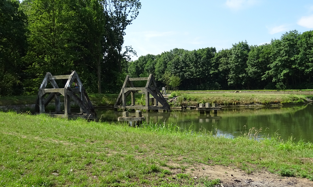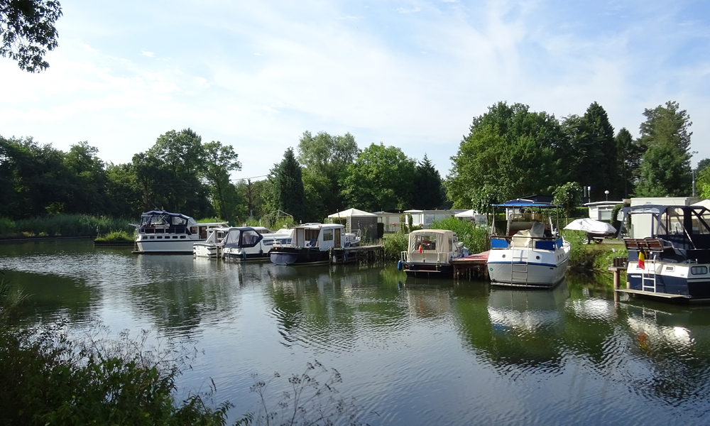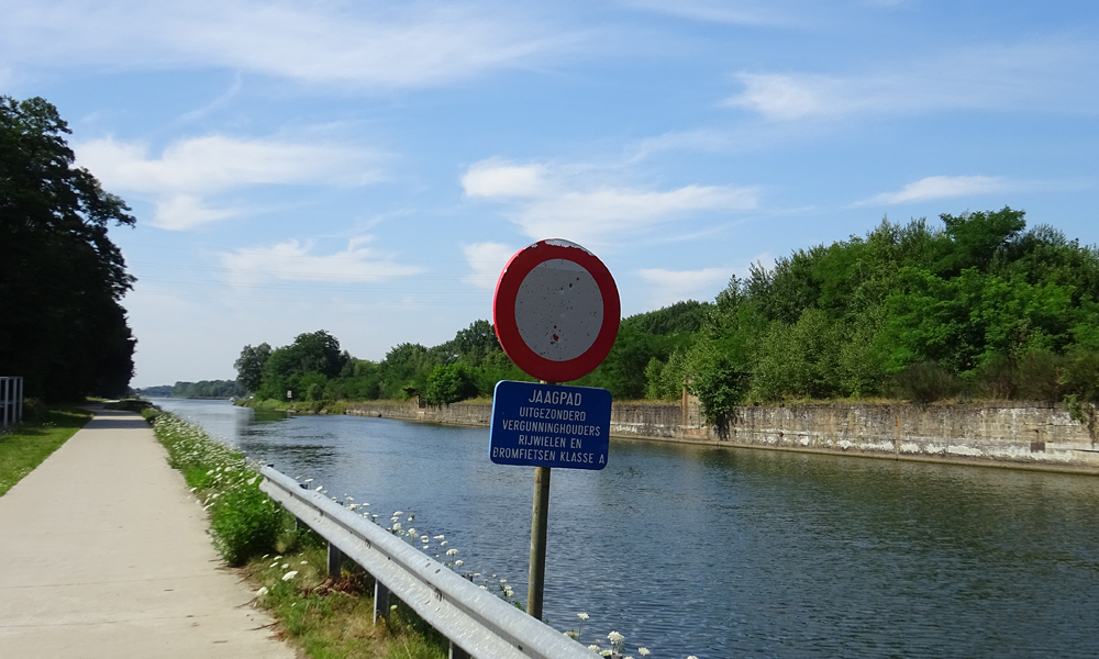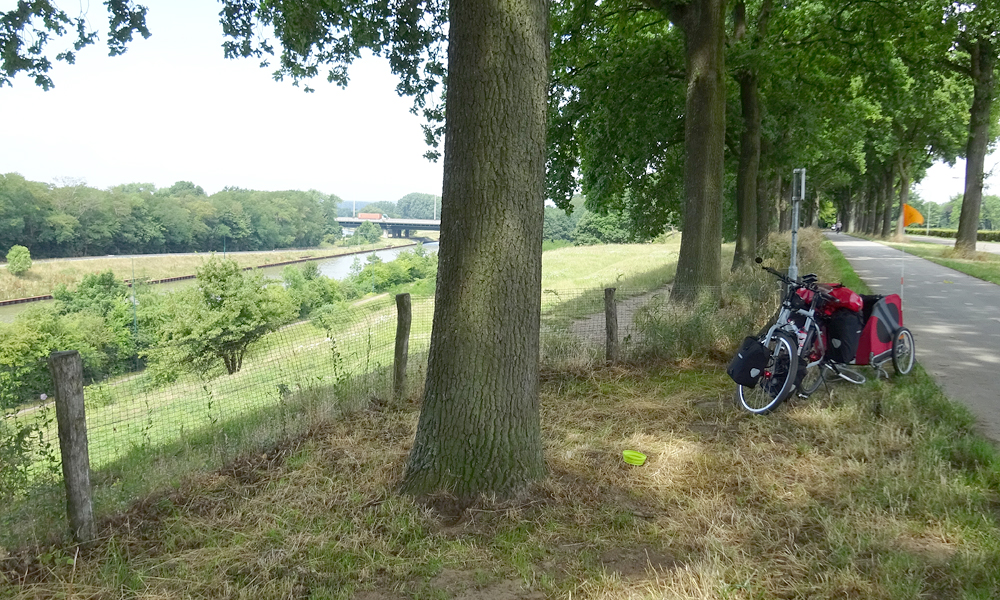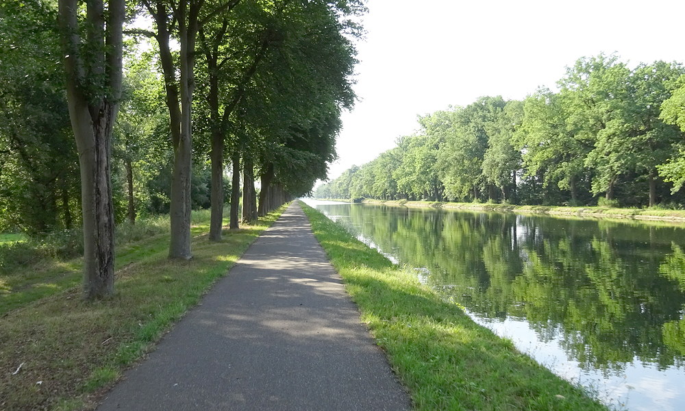 Na een klein half uurtje rijden we alweer langs het kanaal. Gelukkig weer met volop overhangende bomen voor wat schaduw want het is al flink warmer. Het lijkt wel warmer dan gisteren!