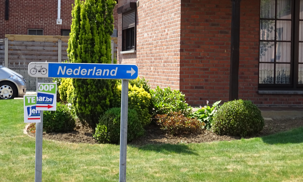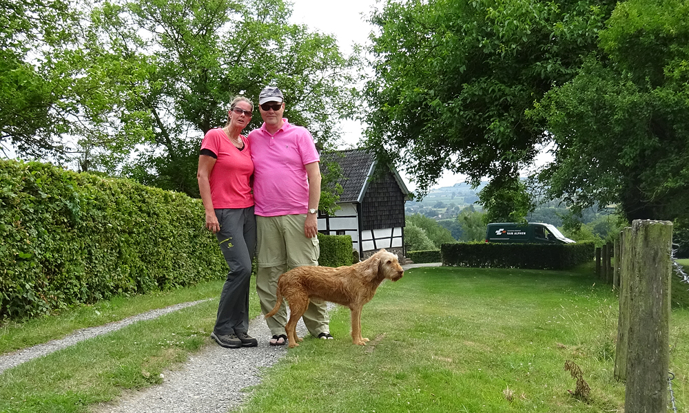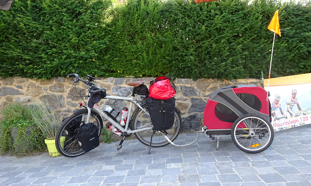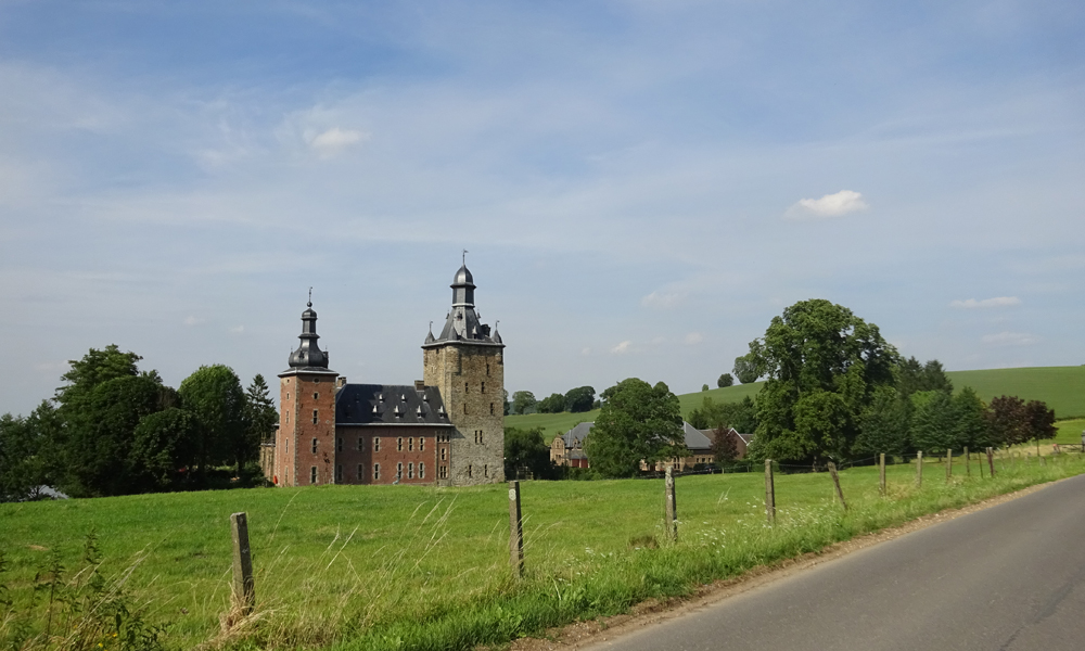 Vanaf daar gaat de weg eigenlijk alleen maar omhoog. We rijden Belgie weer in. De weg gaat heel langzaam omhoog aanvankelijk en dat lukt allemaal nog prima. Over de kasteelstraat en dan over de Rue de Beusdael. Maar dan gaat het mis. Dit is zo’n weg met die scherpe bochten en klimmetjes alsof je naar de wintersport bestemming rijdt. Die trek ik echt niet met die kar achter me aan. Ik scheld en heb het bloedheet. Wat moet ik hier nu mee? Ergens in een bocht stop ik dan maar. Even uitpuffen en wafje uitlaten. Ondertussen bel ik met S. die al lekker in de auto op weg naar huis rijdt na zijn cursus. Dat is wel gezellig.