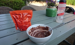 Gisteren fietste ik 93 kilometer en kwam ik uiteindelijk in Belgie terecht in een heel leuk klein huisje voor een klein prijsje. Ik heb lekker geslapen en ben wel vroeg wakker. Aangezien ik weliswaar een korter stukje hoef te fietsen maar wel moet klimmen, kruip ik dus maar uit mijn lekkere bedje en ga woefje uitlaten. Het is heerlijk weer en er is dus geen druppel gevallen. Er was overigens ook geen onweer dus alle stress gisteren was wat dat betreft voor niets. de radar had dus gelijk. Maar het was heerlijk in het huisje en na het wandelen met woefje geniet ik van de stoelen voor het huisje. Lekker even zitten en ontbijten. Omdat ik natuurlijk nog steeds met het verkeerde ontbijt onderweg ben, moet ik dus iets anders verzinnen. Ik kijk wat er aan ‘nood’ voeding in de tas zit en ik zie chocolademousse en soep. Laat ik dat dan maar eens proberen!