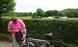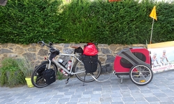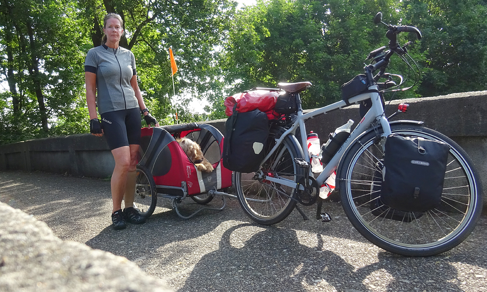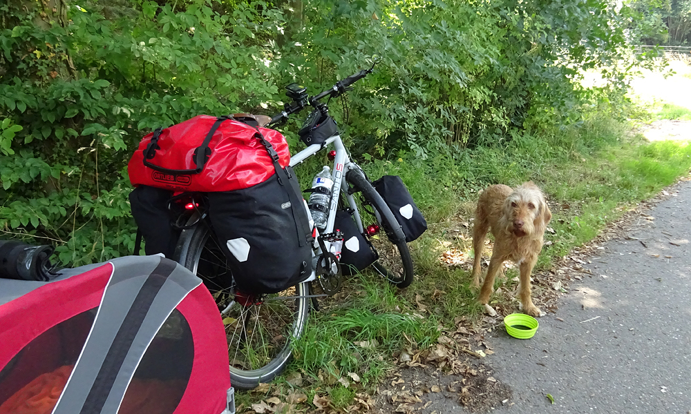 Alles is eigenlijk al klaar voor vertrek als ik buiten zit te ontbijten. De tassen zitten al op de fiets en de fiets staat al voor de deur. Ik ga alleen straks voor de laatste keer nog even het zadel iets naar achteren verschuiven en de handvatten nog iets beter positioneren en dan is het klaar. Ik zou het liefst nog uren willen blijven zitten maar ik moet toch maar eens gaan. Dat is het nadeel van een tocht met een eind tijd en doel. Heb je dat niet, dan kan je dus ter plekke besluiten om ergens te blijven of de plannen/route aan te passen. Nu niet en ik loop nog een laatste rondje met woefje en ga gedag zeggen bij de eigenaar. Die rijdt toevallig net met de boermobiel in de rondte en ik zeg gedag en vraag of hij toevallig een grote PET fles voor me heeft voor water voor woef. Uiteindelijk vinden we er eentje en die vul ik met water voor woef. Later even vervangen voor een schone als ik eindelijk eens een winkel zie onderweg. Even na 8.30 zitten we al op de fiets. Ik ben weer dik ingesmeerd tegen de zon en woefje heeft ook weer wat op haar neusje natuurlijk.