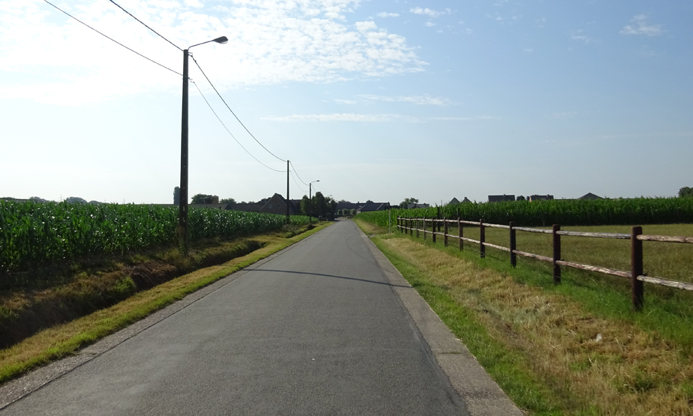 Na de brug sla ik al snel weer rechtsaf en ga het groene gebied weer in. Weg van de snelweg dus. Ik neem aanvankelijk netjes het fietspad dat al snel onbegaanbaar wordt. Ik moet dus weer terug en fiets verder over de weg. Dat is blijkbaar de bedoeling. Er is hier overigens geen kip natuurlijk.