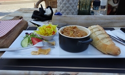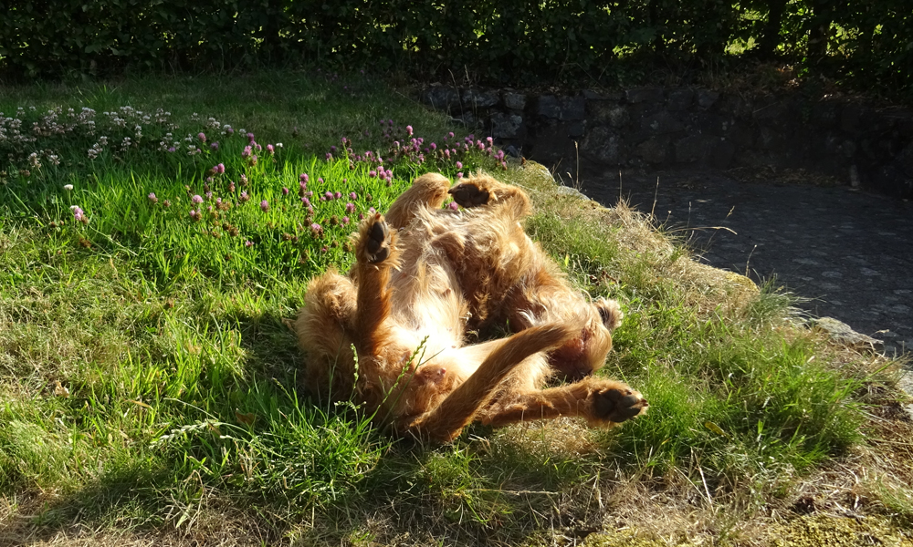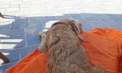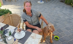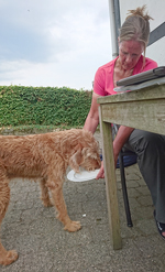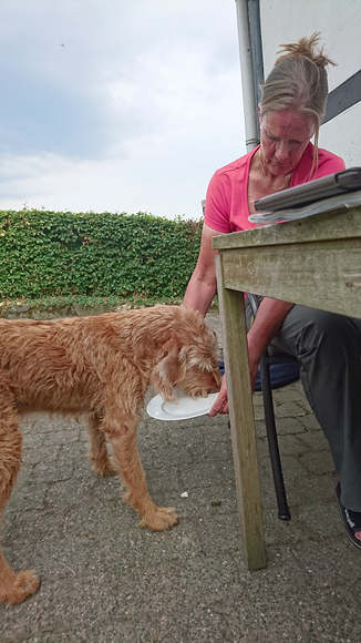We laten woefje een paar keer uit rond het huisje. Niets geks zodat iedereen even uit kan rusten. Bovendien is het veel te warm natuurlijk. We gaan nergens heen en eten lekker op het terrasje bij het huisje. S. nam zelfs hart mee voor woef dus die wordt ook verwend.