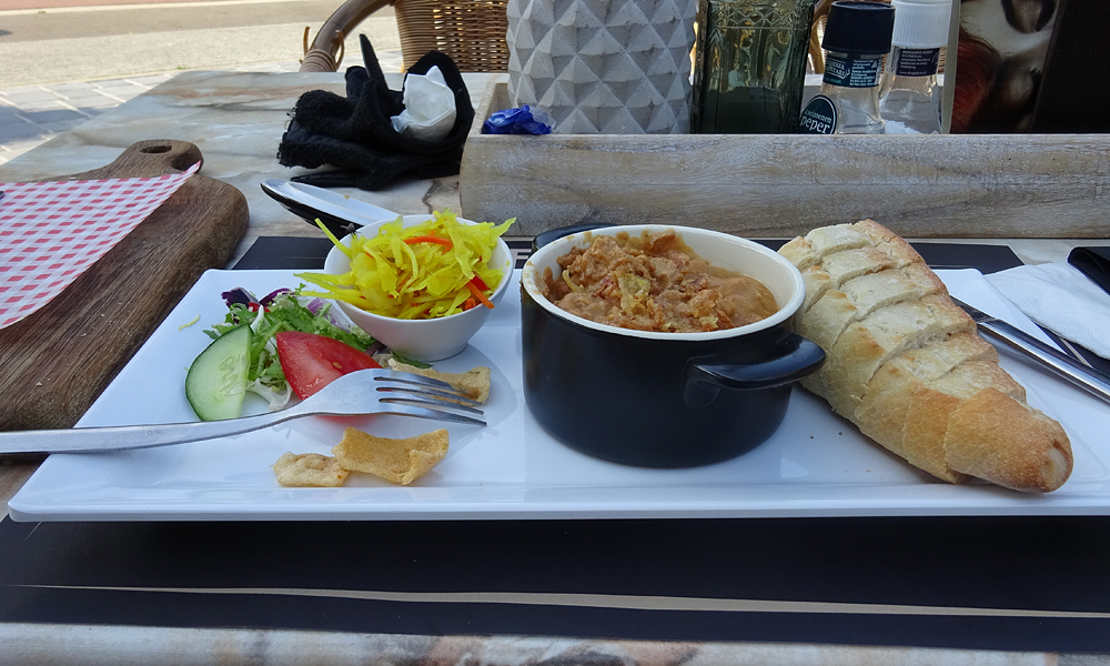 Ik zie ergens links een restaurant met panorama uitzicht maar als ik de parkeerplaats oprijd, zegt iemand dat ze gesloten zijn. Balen want het leek me wel wat om iets te eten met mooi uitzicht. Als ik er dan nu toch bijna ben? Maar hij wijst me naar een restaurant even verderop. Ik rijd ongemerkt de afslag die ik eigenlijk moet hebben naar de camping voorbij. Als ik dat in de gaten heb twijfel ik even of ik wel dat kleine stukje moet doorrijden maar het is echt heel kort dus ik ga inderdaad eerst lekker wat eten en even zitten. Even na 18 uur ben ik eindelijk op een terras en bijna bij mijn einddoel voor vandaag.