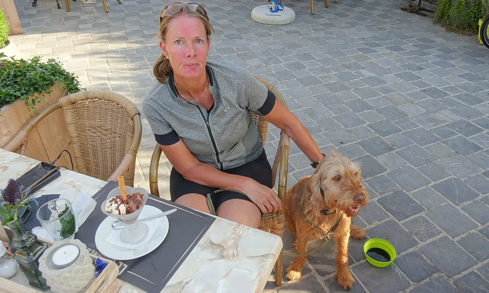 Ondertussen slaat de twijfel toe over de camping. Is daar wel schaduw? Het is de bedoeling dat S. morgen komt en dat we dus een dagje lekker kunnen luieren. Maar als de tent in de bloedhete zon staat, is er niks aan natuurlijk en al helemaal niet voor woef. De ober kent het daar wel en zegt dat het alleen een veldje naast de boerderij is. Ik heb lousy verbinding en S. zoekt ondertussen mee naar iets anders. Dat is er eigenlijk niet echt. Gene Zijde in Camerig lijkt wel wat. Daar keken we notabene al eerder naar. Maar door al dat gedoe tikt de tijd verder. Uiteindelijk besluit ik maar gewoon te gaan kijken op die camping. S. neemt de tarp mee voor schaduw en we zien het wel. Het is al hartstikke laat inmiddels.