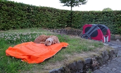 Ik ga gauw de fiets weer halen die nog op het veldje staat en daarbij verlies ik de OMM zitmat die iemand gelukkig later terug brengt. Dat is wel heel fijn! Ik pleur mijn fiets bij het huisje en ruk alles snel van de fiets. Eerst even zitten nu. Wafje ligt al snel heerlijk te maffen op haar bedje en is helemaal tevreden. Ik ook want het is een mooie warme avond en ik blijf nog lang in mijn fietskleren buiten zitten telefoneren met S.