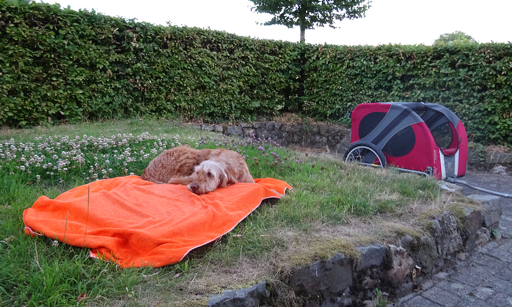 Vandaag ga ik niet fietsen. Dit is eigenlijk mijn eindpunt voor deze route. Morgen ga ik samen met S. naar Aken naar mijn ouders en vandaag hebben we dus gewoon een gezellige dag hier. Met het mooie weer is het huisje wel luxe! Tafeltje, stoelen en een tuintje waar woef lekker kan liggen. Koeien om ons heen en stilte. Hij komt tegen de middag aan dus in de ochtend hang ik heerlijk in de ochtend zon en lees op de e reader.