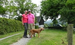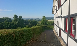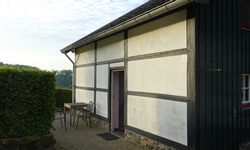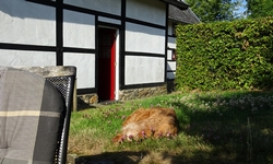 De vrouw van de camping gaat me voor naar het veld. Woef moet eruit en zij duwt de kar naar boven. Het veld is mooi en rustig met geweldig uitzicht. Onderweg had ik gevraagd of een van de vakwerkhuisjes toevallig nog leeg was dit weekend. Dat bleek zo te zijn en we spreken af dat ze straks even zal laten weten wat het zou kosten als ik daar 2 nachten in zou gaan. Morgen ochtend komt S. en het zou best fijn zijn om een huisje te hebben eigenlijk! Ik ga even later met haar kijken en spreek af dat we 175 euro betalen. Duur maar het is een huisje en voor 2 personen en 2 nachten is het nog wel redelijk.