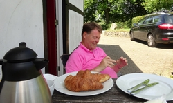 Rond 13.30 besluit ik weer even pauze te houden en iets te eten. Vandaag kan ik mijn lichaam beter verzorgen qua brandstof dus dat moet ik ook gewoon doen. Ik neem nu de croissantjes en die smaken ook prima. Wafje gaat weer lekker in de schaduw slapen en drinkt ook wat.