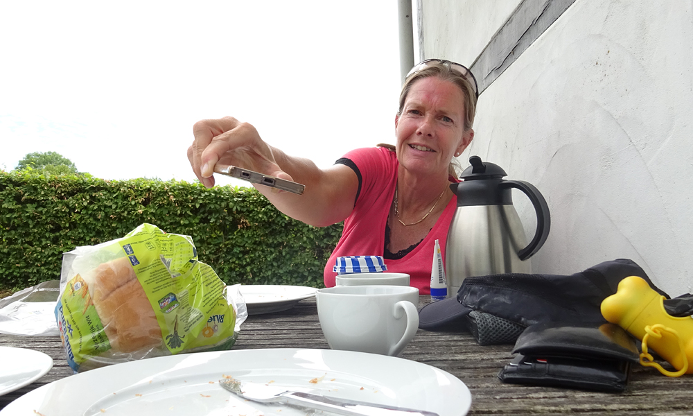 Om 10.45 is het bijna tijd voor wafje en ik wil ook wel even pauze. Ik ben natuurlijk pas 5 kwartier onderweg maar het gaat prima en ik wil wel even pauze. Het rijden gaat een stuk lekkerder dan gisteren in ieder geval.