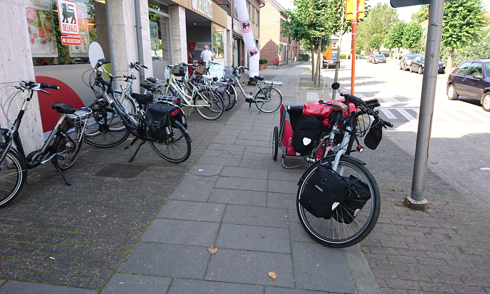 Na een uurtje zie ik op mijn navigatie plotseling een POI met een winkelmandje. Er is hier blijkbaar een winkel in de buurt! Misschien een bakker ofzoiets? Ik besluit even van de route af te gaan en kom terecht in Neeroeteren. Na vragen blijkt er een Delhaize te zijn en daar ga ik dus even water en brood halen voor onderweg. Eindelijk een winkel!