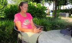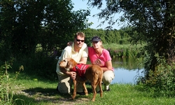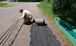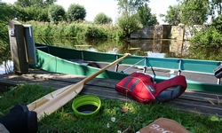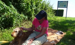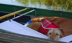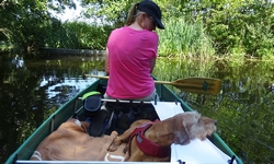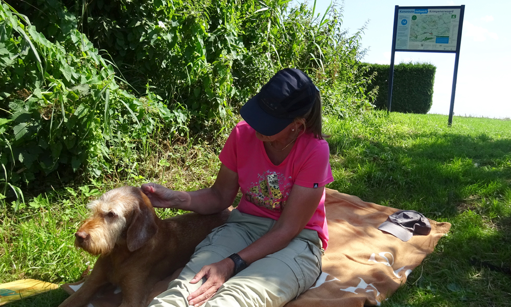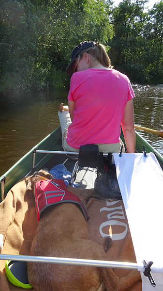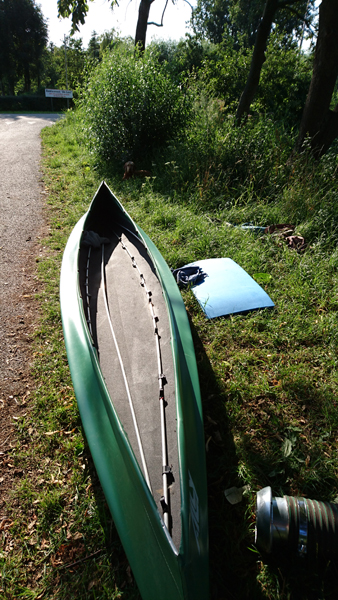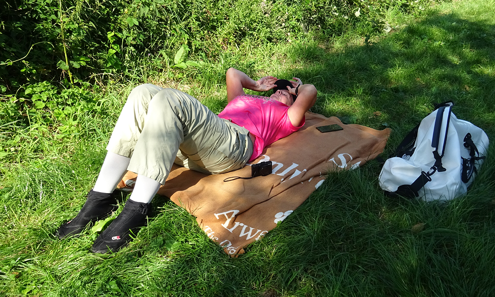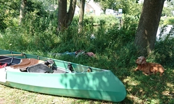 Met nog geen uurtje varen zijn we weer terug bij de start en gaan we de boot weer opruimen. Daar komen toevallig net de fietsers aan die we ook zagen toen we aan het opbouwen waren. We worden dus even aan de praat gehouden over het opbouwen en afbreken van de boot en hoe dat nou allemaal werkt. Het afbreken gaat dus even langzamer dan normaal maar uiteindelijk zit alles in de tas. Grappig genoeg is de mat deze keer eigenlijk niet nat geworden dus dat is makkelijk. Er zijn wel enkele stangen weer kapot (veer) dus die laten we er even uit zodat S. die kan repareren met een nieuwe veer. Woef ligt lief te wachten in de schaduw tot we klaar zijn. Daarna gaan we haar even uitlaten in het natuurgebied. het blijft mooi daar hoewel we ons verbazen over het verkeerslawaai van de (relatief rustige) weg. Zo zie je maar dat er eigenlijk overal wel lawaai en geruis is. Stilte is in dit land toch moeilijk te vinden blijkbaar.