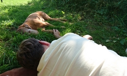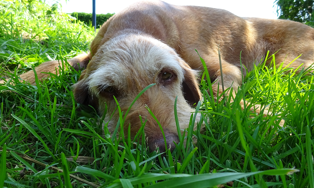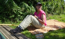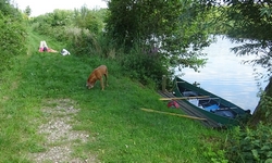 Na 20 minuutjes varen zijn we al bij het steigertje. We leggen weer aan en leggen het bedje van woef lekker op het gras in de zon. Daar ga ik weer lekker op liggen. Ideaal ding. Het is wel erg lui maar toch hebben we inmiddels met dat beetje varen wat we gedaan hebben al ruim 4,5 km afgelegd. Dat is dus helemaal niet zo slecht.