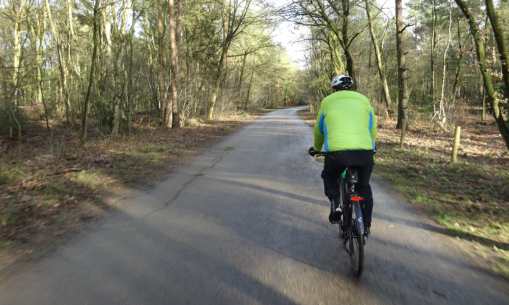 Als we weer echt op de terugweg zijn richting Hulshorst is de accu van S. leeg. Niet van zijn fietsje want die heeft geen accu maar van zijn lichaam. We doen een tandje terug en waar ik even lekker doorscheur, wacht ik hem op en maak meteen een leuke foto van die arme stakker op zijn fietsje. Gelukkig vindt hij het wel mooi en leuk. Ik heb overigens ook een probleem want ik kan nauwelijks meer schakelen met mijn vingers. Ik heb me niet gerealiseerd dat het zoveel slechter is geworden in een klein jaar sinds we deze fietsen kochten. De Alfine rijdt heerlijk maar schakelt vrij zwaar. Misschien laten ombouwen naar een ander schakelsysteem?