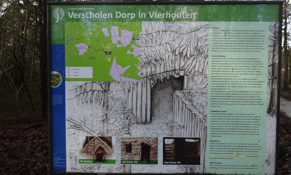 We rijden via de knooppunten richting nummer 18 en dan rechtsaf richting het Verscholen Dorp in Vierhouten. Vreemd genoeg staat er aan het begin van de afslag wel een bordje dat het op 3.7 km ligt, maar ik zie ter plekke bij toeval het informatie bord staan omdat er mensen op staan te kijken. Ik was er anders mooi voorbij gescheurd denk ik.