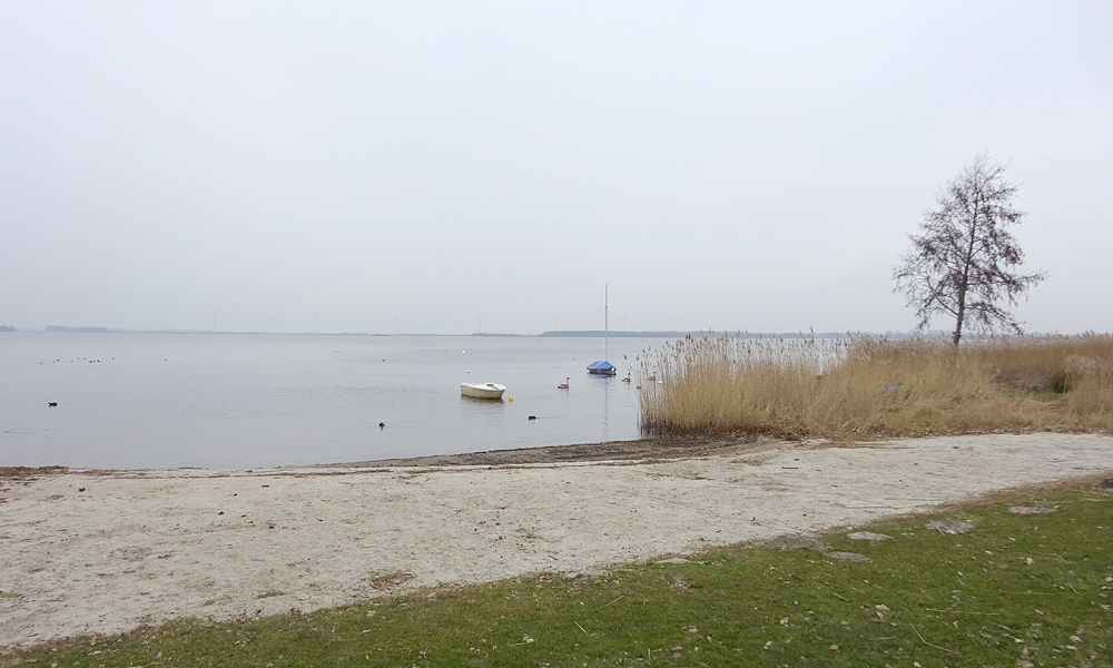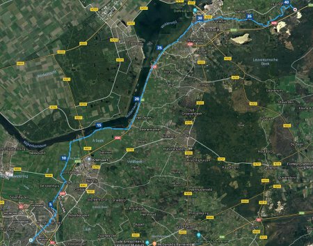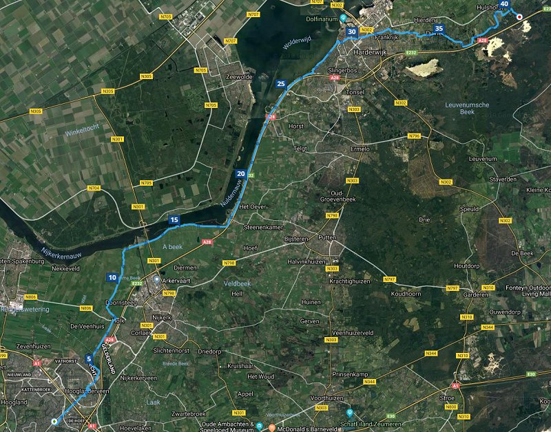 Na 19 km denkt Garmin ineens dat ik bij het eindpunt ben. Ik ben pas bij strand Horst maar ik heb het eindpunt bereikt blijkbaar. De route stond wel helemaal getekend maar ergens zit dus een eindpunt geprogrammeerd. Jammer maar niet erg want ik kom straks in Harderwijk en dan zal ik het verder wel kunnen vinden neem ik aan. Overigens is het stukje langs Nulde en Horst niet leuk omdat je vlak langs de snelweg fietst. Ik had gedacht dat je dichter langs het water zou fietsen maar dat is dus niet zo. Niks an maar weer iets geleerd. Elke keer als ik met de auto langs rijd, denk ik dat het leuk is om daar te fietsen maar ik weet dus nu dat het niet zo is. Ik zie het pontje naar Zeewolde en ga thuis eens kijken of dat nog perspectieven biedt voor een rondje. Ik kijk ook even snel op de kaart waar ik nu heen moet en programmeer ons adres in de garmin. Ik neem aan dat de garmin me ook gewoon netjes naar mijn adres kan brengen (nee dus).